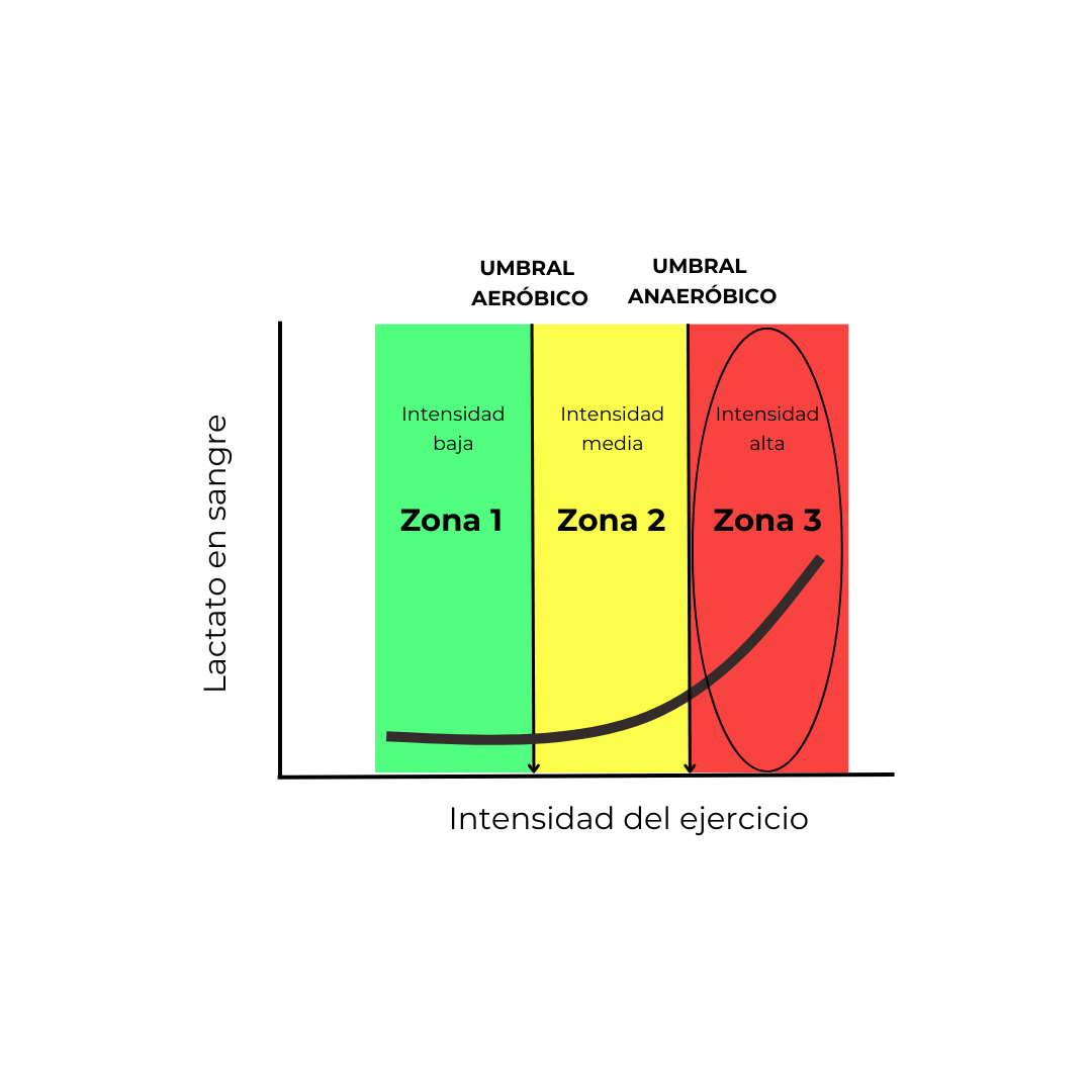 Durante este nivel de intensidad, el cuerpo necesita reclutar todos los tipos de fibras musculares: fibra tipo I, tipo IIa y tipo IIb, siendo estas dos últimas altamente demandantes de la vía glucolítica. Por tanto, y con mucha diferencia respecto a las otras dos zonas mencionadas en las anteriores publicaciones (zona 1 y zona 2), los hidratos de carbono son la fuente de energía principal para lograr las demandas de intensidad.