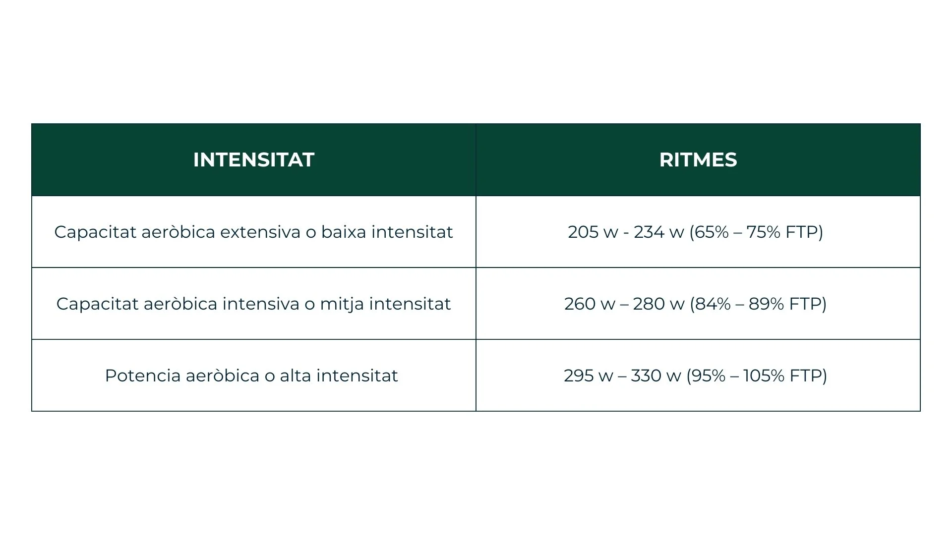 Us deixem una taula perquè us resulti fàcil saber a quines intensitats heu de córrer o pedalar per treballar cadascuna d’elles de forma específica: